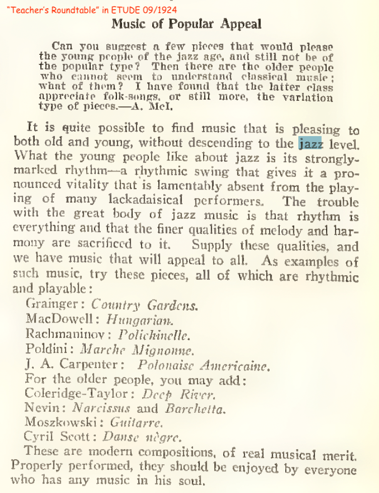 It’s no surprise that yestercentury’s verdicts on jazz included plenty of praise and lots of bile. New music always gets the same criticisms: lacking quality, spreading immorality, derivative of older music, and a lot of racist claims ranging from veiled to brazen but uniformly disgusting. Yet as jazz spread across the United States and the world, some voices took a middle ground. For them, jazz wasn’t worth the venom. It was neither great music nor a threat. It was harmless fun, but jazz still served an important purpose: helping people appreciate music deemed better than jazz.