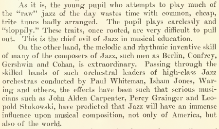 …able musicians tamed down [filling in] to one instrument at a time, until today we have it really being done artistically and according to rule…the erstwhile blatant jazz has given way to smoothly flowing beautifully voiced harmony and rhythm…arrangers and directors who took the raw jazz as it came from New Orleans and change it into the aristocratic variety we have today…If jazz was the essence of the noise we experienced in some popular types of music four or five years ago, then we have very little jazz left, as it can be proved with anyone’s ears that noise minus reason is virtually absent in our good orchestras of today.