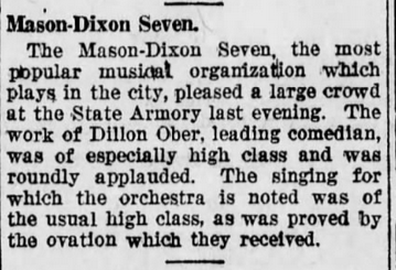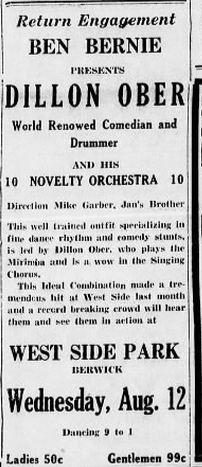 About a year before his first recordings in New York City with Pettis, Ober fronted a band under the auspices of Bernie himself: This article mentions an “attraction direct from Broadway” yet Bernie’s Hotel Roosevelt Orchestra was firmly installed at the posh Manhattan hotel. Even more odd, another article from the same paper mentions Ober right alongside “the Old Maestro” himself! Typo? Name dropping? Either way, Bernie must have had some experience with Ober prior to his arrival in New York City, perhaps relying on Ober to direct bands contracted by Bernie for work around Pennsylvania. Most revealing is that Ober had led at least one band and was in the spotlight before coming to New York City. Showing a knack for good copy, Ober even describes his group as “the last word in fine dance music,” with further notices afterward:
