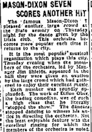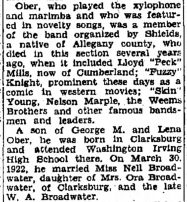 How Ober began playing is unclear but he obviously started young. Born April 8, 1904 in West Virginia, by 1919 young Dillon was already listed as a “musician” in the Clarksburg town directory. He cut his first record in 1922 playing marimba with the Mason-Dixon Seven Orchestra. The band included future dance band star Ted Weems and his brother Art and was popular at West Virginia University. It also traveled as far as University of Michigan and the town of Beaver, Pennsylvania as well as New York City to cut one unissued take of “I’m Just Wild About Harry” for Columbia with the young marimba player. The Seven might have also worked in Philadelphia, or perhaps Ober was in town solely for his wedding to Alice “Nellie” Broadwater in 1922. The young couple lived with Ober’s (apparently very patient) parents through 1925 while he continued to work as a musician.