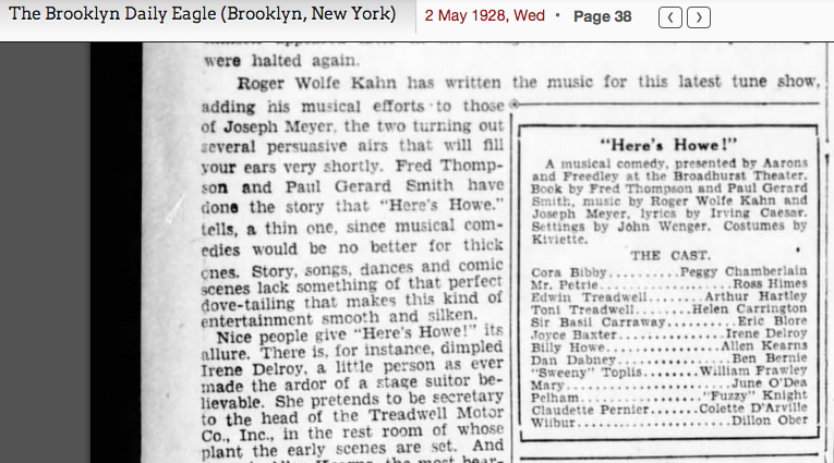 By (at least) December 1926, Ober was in New York City at his first recording session with Pettis, going on to complete his recorded legacy periodically throughout the next four and a half years with Pettis, Irving Mills and eventually as a replacement for Sam Fink in the Brunswick studios with Bernie’s band. By May 1928 he also begins to appear in acting credits, such the Here’s Howe, with music by Roger Wolfe Kahn: