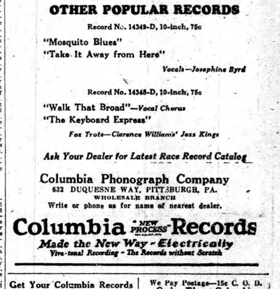 Stacking both records side by side, we can compare Clarence Williams and Fred Rich, one’s Jazz Kings and the other’s Orchestra. Music historians might discuss jazz and popular music. Record collectors might subdivide hot and commercial, stomp and pep. In terms of performance, there is the distinction between arrangement and (some) improvisation. Compositionally, it’s a matter of a jazz tune and a Tin Pan Alley song. From a marketing perspective, one is a race record and the other (just) a record.