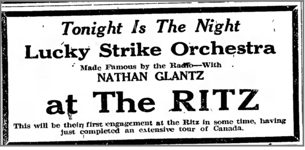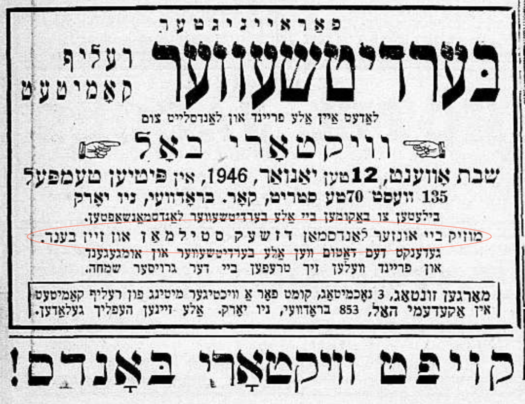 Offering entertainment all day, the National must have kept Stillman busy as both musical director and the composer of several shows. His work was popular enough to earn him billing in ads featuring the stage stars booked at the National. Plus, he kept volunteering. Ads for a victory bond fundraiser dance sponsored by the Berdychiv landsmanshaft (social organization) proudly announce “music by our countryman Jack Stillman and his band.”
