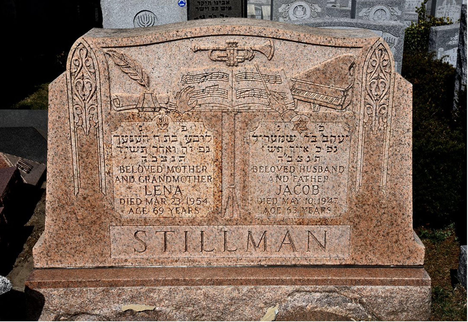Jacob and Lena Stillman’s headstone inscriptions say it all: a quill pen with paper and a piano flank a trumpet suspended over a pair of hands holding a baton in front of a musical score. Musician and bandleader (as well as living patron saint of this era’s music) Vince Giordano notes that the music on the score is “Hatikvah,” the national anthem of the Zionist movement at the time and then the state of Israel. This was also the couple’s headstone. Lena may have also been a musician or simply shared her husband’s love of music and pride in his heritage.