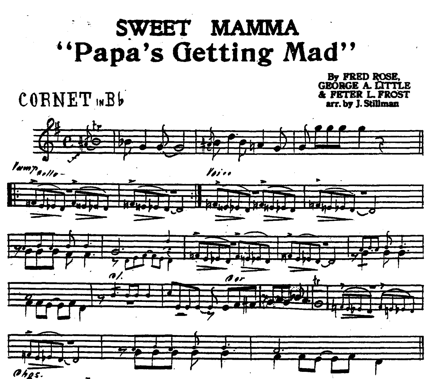 Either way, from that point, Stillman was mainly associated with dance music on record. He had already published several arrangements. His charts from this period ranged from romantic songs like “I Found a Rose in The Devil’s Garden” and waltzes such as “In My Tippy Canoe” to fox trots poised for hot treatment like “Daddy O’Mine” and “Sweet Mama, Papa’s Getting Mad.” Stillman also arranged novelties with humorous titles ( “”) and exotic-sounding tunes (e.g., “Silver Sands Of Love” and “Cairo Moon”). Several of these compositions were written and published by Fred Fisher, whose numerous song credits include the record-breaking “Dardanella” and still popular “Chicago.” The Tin Pan Alley mover would have been a useful connection early in Stillman’s career.