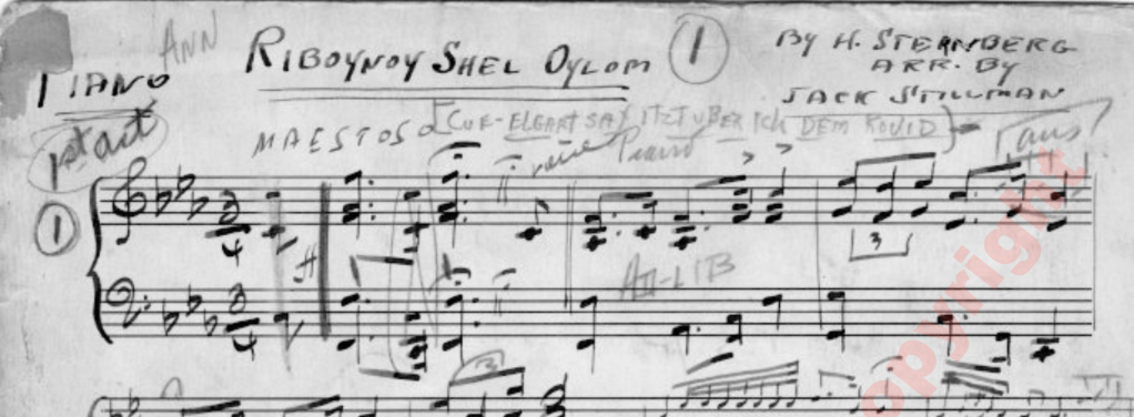 The YIVO Institute for Jewish Research has an extensive archive of records from the Hebrew Actors’ Union. That includes pages from Jack Stillman’s arrangements for the theater from 1945 until his death. Most of the song titles are in Yiddish, and most song folios are incomplete, filled with random parts for various brass, reed, string, and rhythm section instruments. It’s also unclear whether Stillman or a copyist wrote these manuscripts. Yet they’re one of the few original documents left behind by this talented musician.