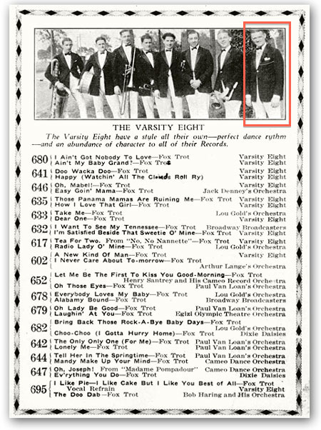 Vince Giordano mentions the ODJB and vaudeville artists of the early twenties as just a few examples of a bass part playing two-to-the-bar, just like in ragtime, while horns phrase in eight like the right hand of a ragtime pianist. Later on in the twenties, some jazz bands would keep the two-beat bass but without the ragtime “tinge” of the earlier bands.